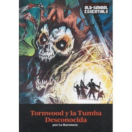 Tornwood es un suplemento para Old-School Essentials que consta de una aventura de mazmorras clásica para personajes novatos: la Tumba Desconocida; una localización de inicio completamente detallada para prepararse antes de cada aventura y un mapa del entorno que los personajes van a ir conociendo en sus exploraciones.